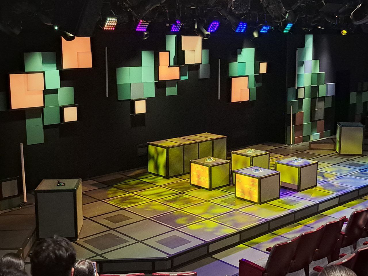 그러나 뮤지컬 오즈는 소설 오즈의 마법사를 모티브로 하긴 했지만, 완전 별개의 이야기 입니다. 소극장의 작은 무대 위로 이야기를 옮겨 오기위해 오즈의 마법사를 찾아 떠나는 준과 양철을 제외하고는 모든 것들을 과감히 없애 버렸습니다. 극 중 배경도 마찬가지 입니다. 연출자가 배경을 VR 세상의 가상 세계로 제한하면서 사악한 서쪽 마녀를 물리치러 가는 모험을 좁은 소극장 무대에서 머리를 짜내어 만들어 낼 필요가 없어졌습니다. 바닥과 무대 위 소품을 사각형 큐브로 하고  여기에 적절한 조명을 통해서 테트리스 같은 느낌을 주는 것으로  충분합니다. 이것으로 연출자는 게임 속에서 깨야 할 미션 장소를 만들어 냅니다.